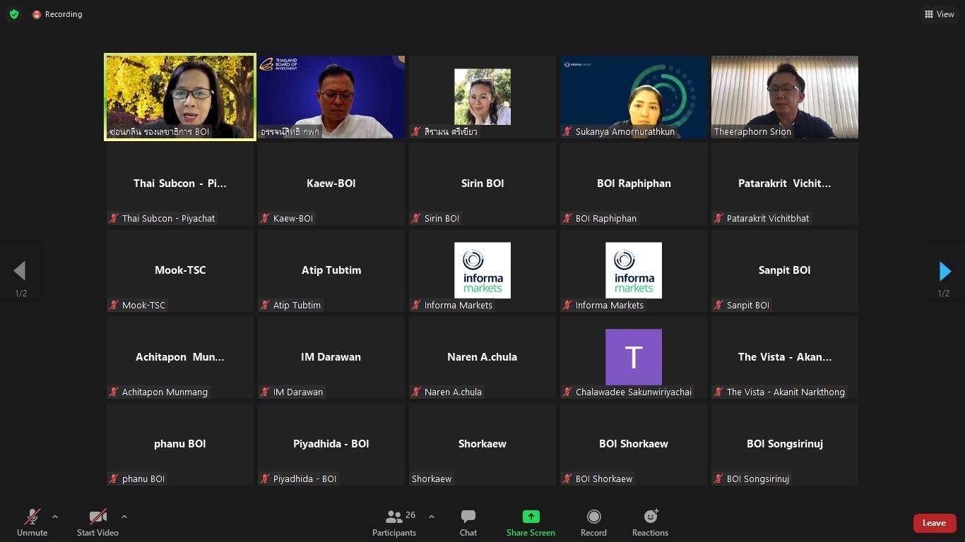 วันพฤหัสบดี ที่ 7 เม.ย 2565 คณะผู้จัดงาน Subcon Thailand 2022 โดยมีคณะทำงาน สำนักงานคณะกรรมการส่งเสริมการลงทุน(BOI) สมาคมส่งเสริมการรับช่วงการผลิตไทย(Thai Subcon) บริษัท อินฟอร์มา มาร์เก็ต ร่วมประชุมผ่านระบบ Zoom Online นำโดย คุณซ่อนกลิ่น พลอยมี รองเลขาธิการคณะกรรมการส่งเสริมการลงทุน (บีโอไอ) เป็นประธานในที่ประชุม