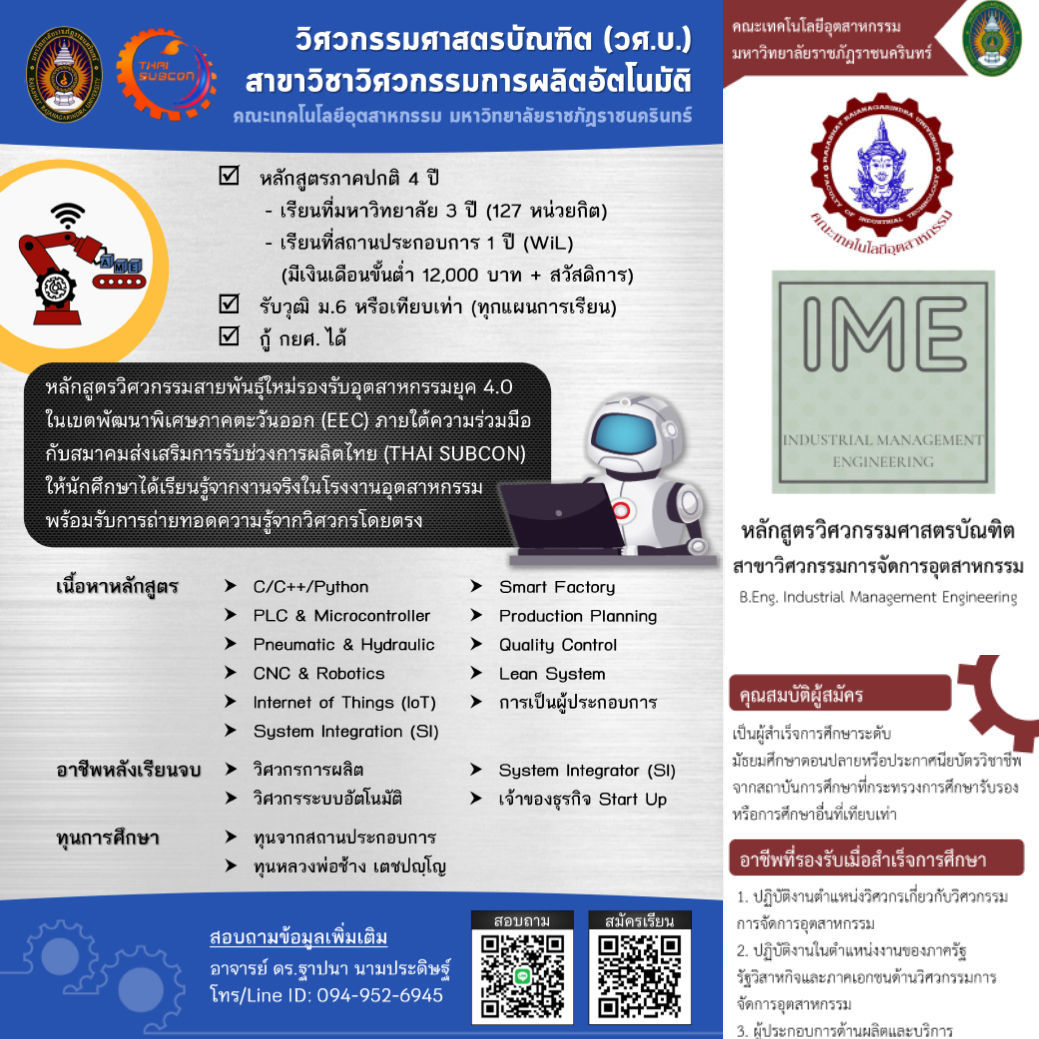 โดย ทางหลักสูตรวิศวกรรมศาสตรบัณฑิต สาขาวิชาวิศวกรรมการผลิตอัตโนมัติ คณะเทคโนโลยีอุตสาหกรรม มหาวิทยาลัยราชภัฏราชนครินทร์ และ สมาคมส่งเสริมการรับช่วงการผลิตไทย มีความร่วมมือกันในการจัดการศึกษาหลักสูตรวิศวกรรมศาสตรบัณฑิต สาขาวิชาวิศวกรรมการผลิตอัตโนมัติ (Bachelor of Engineering, Automated Manufacturing Engineering) หลักสูตร 4 ปี