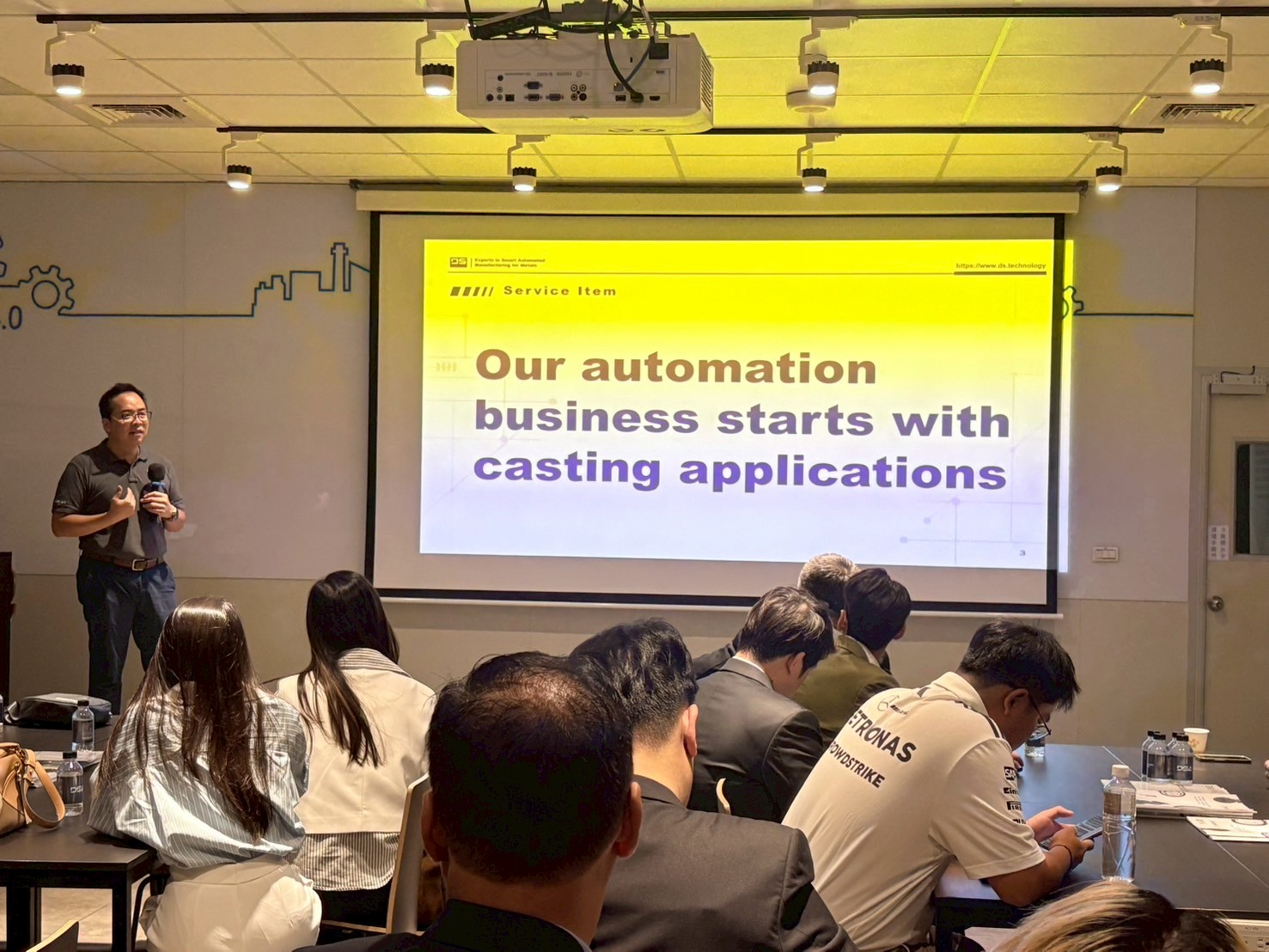 เยี่ยมชมบริษัท DS Technology: ในช่วงเช้า คณะผู้ประกอบการได้เข้าเยี่ยมชมบริษัท DS Technology ซึ่งเป็นผู้เชี่ยวชาญด้าน Smart Manufacturing และ Automation Solutions สำหรับอุตสาหกรรมโลหะโดยเฉพาะ บริษัทแห่งนี้ก่อตั้งขึ้นในปี 2013 โดยให้บริการระบบขัดผิวหุ่นยนต์ (robotic surface finishing), ระบบหล่ออัตโนมัติ (casting automation) และระบบโรงงานที่ผสานรวมปัญญาประดิษฐ์ (AI-integrated factory systems)