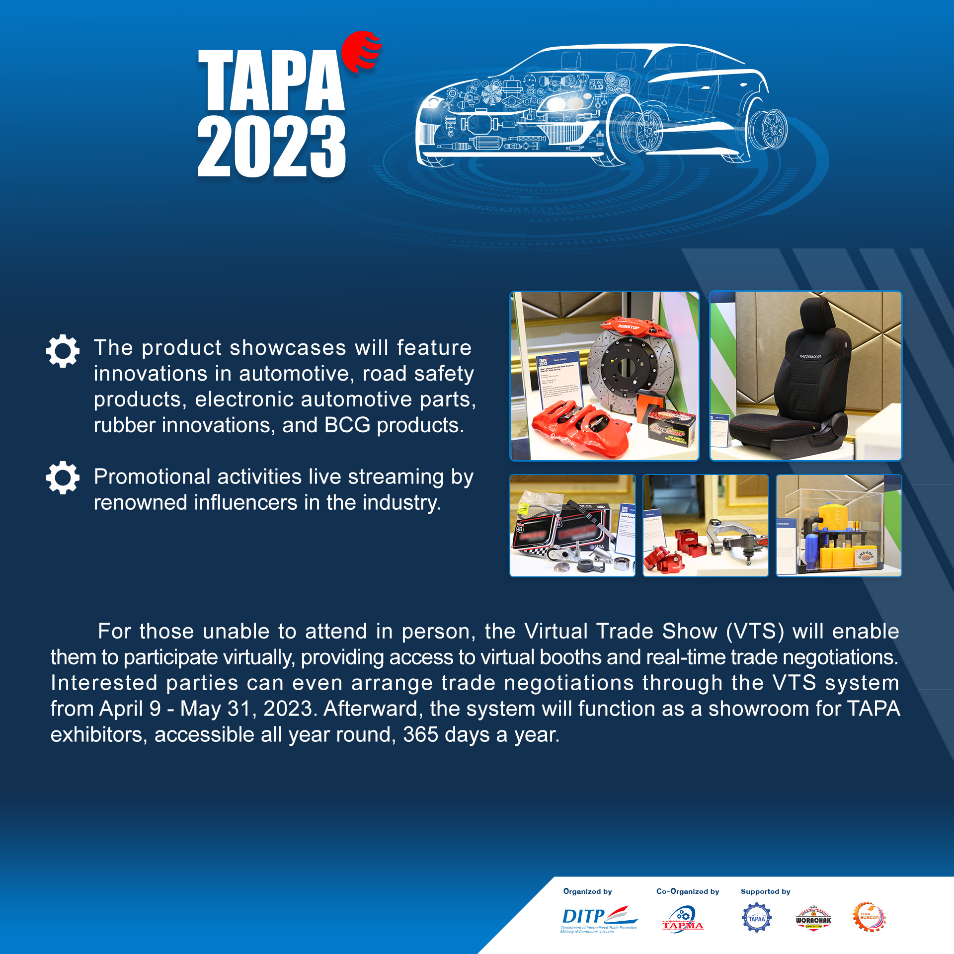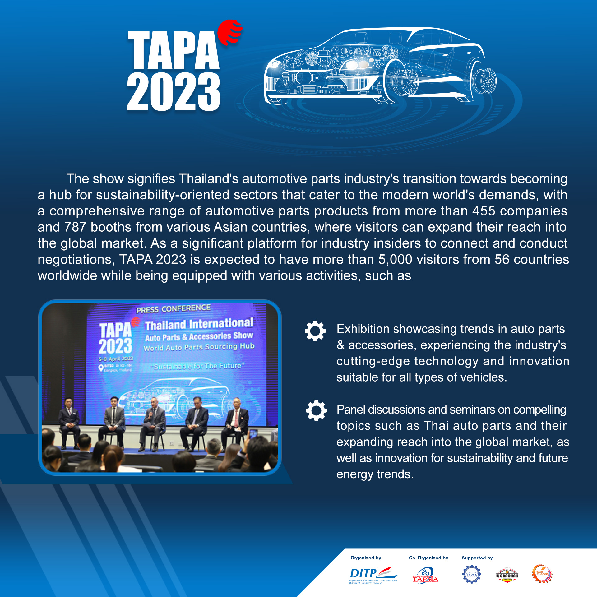 TAPA 2023, the biggest trade show of automotive parts in ASEAN, the hub of products from more than 455 companies, and 787 booths from various Asian countries, opens the door to opportunities for expansion to reach the global market, for those who work in industry insiders to connect and conduct negotiations.