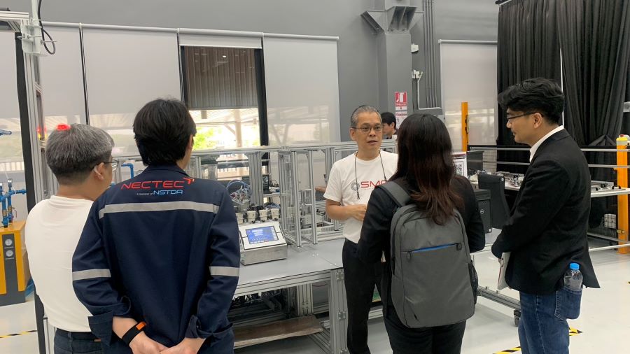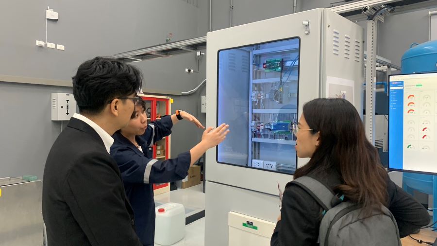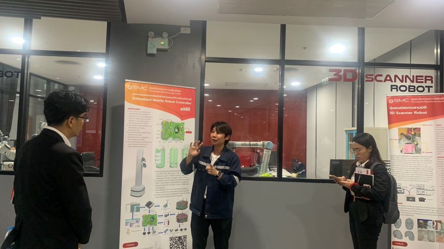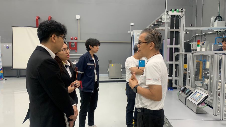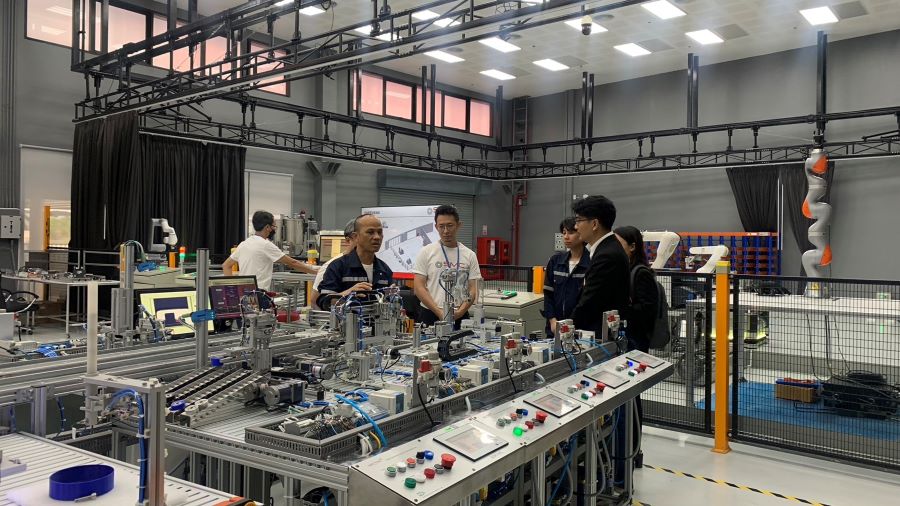 คณะฯ ได้เข้าชมระบบต่าง ๆ ภายในศูนย์การเรียนรู้นวัตกรรมการผลิตยั่งยืน เช่น ระบบจำลองโรงงานการผลิตสินค้าที่มีองค์ประกอบของเทคโนโลยีของการควบคุมระบบการผลิตอัตโนมัติด้วย ในรูปแบบมาตรฐานอุตสาหกรรม มีการแสดงผลการผลิตแบบ Real-Time บนจนแสดงผลด้วยระบบ SCADA โดยแสดงผลการวิเคราะห์ประสิทธิผลของเครื่องจักรในระบบสายการผลิตทั้งหมดของโรงงาน