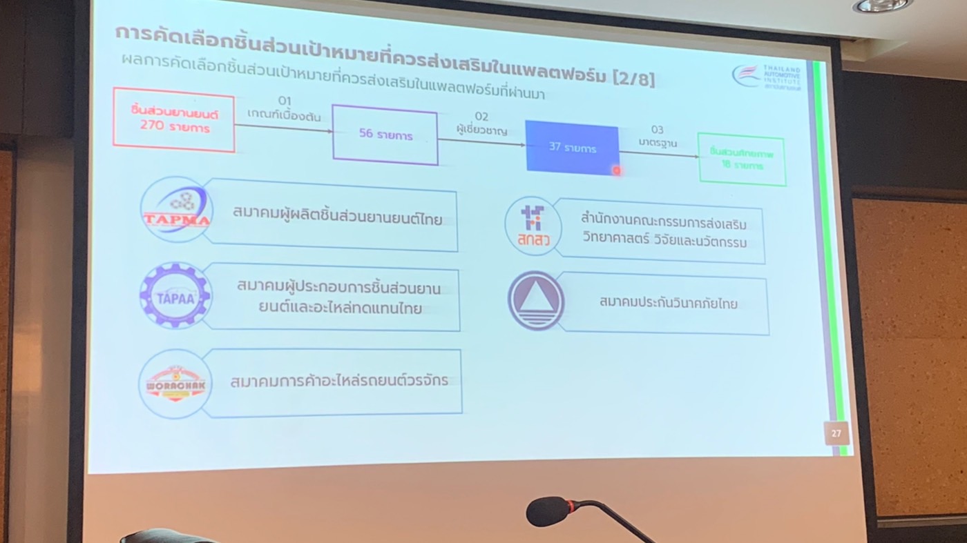 ในที่ประชุมได้สรุปผลการวิจัยเพื่อดำเนินการจัดทำ Platform การซื้อขายอะไหล่ทดแทนในประเทศไทย วัตถุประสงค์เพื่อ 1) ศึกษาโครงสร้างทางธุรกิจอุตสาหกรรมชิ้นส่วนในประเทศไทย