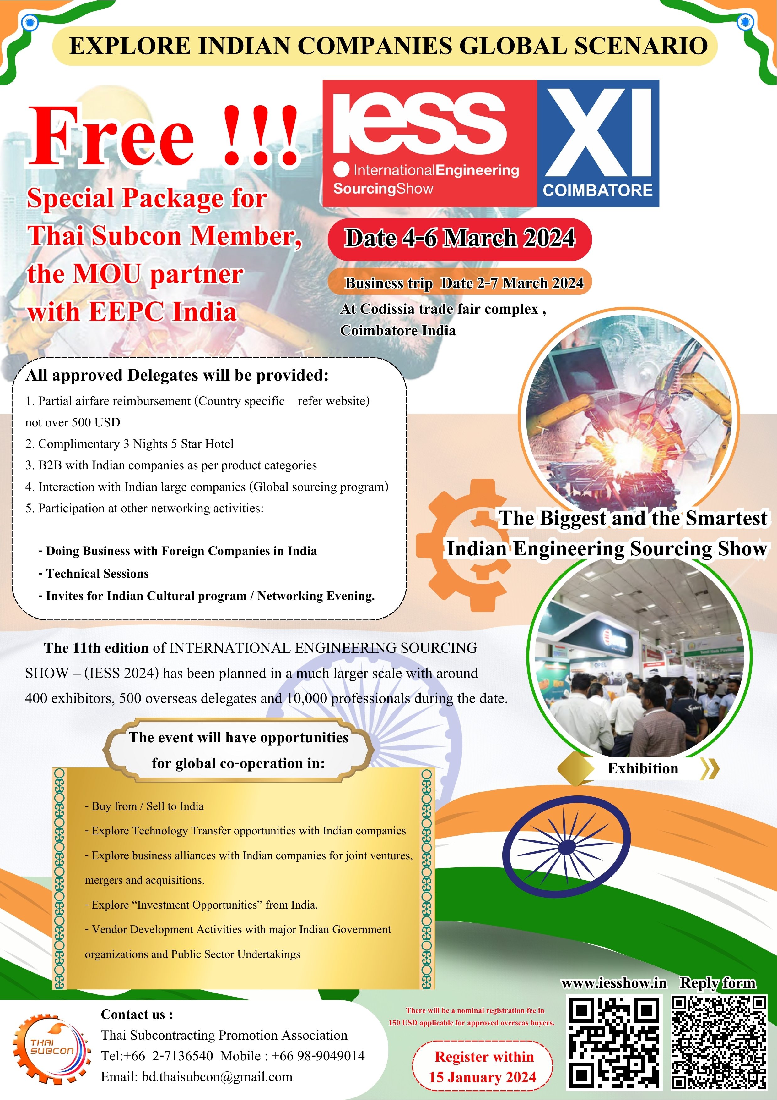ขอเชิญเข้าร่วม Business Trip ศึกษาดูงานอุตสาหกรรมในประเทศอินเดียกับงานแสดงสินค้า International Engineering Sourcing Show (IESS) ครั้งที่ 11