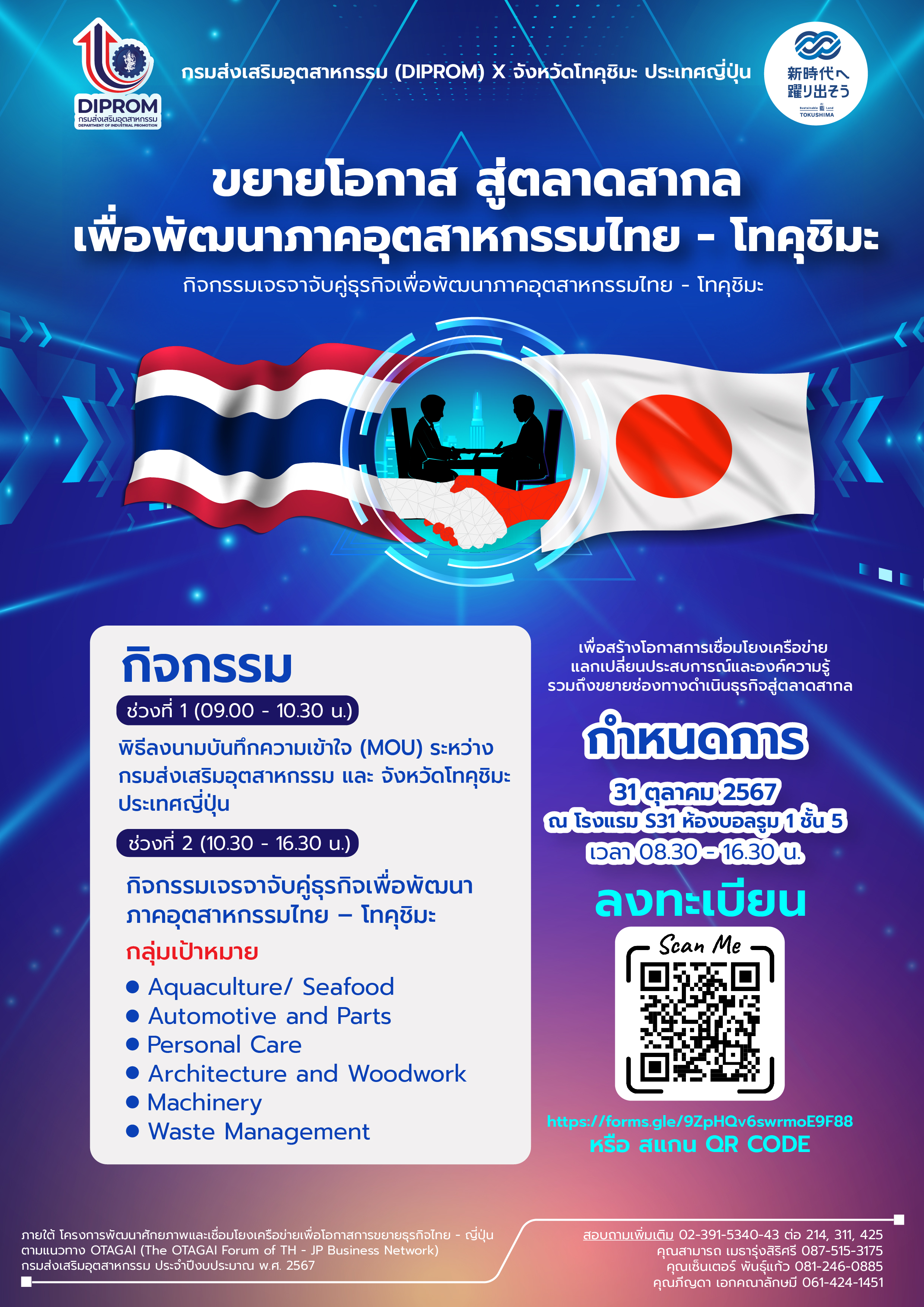 ขยายโอกาส สู่ตลาดสากล เพื่อพัฒนาภาคอุตสาหกรรมไทย - โทคุชิมะ ด้วยกิจกรรมเจรจาจับคู่ธุรกิจ สร้างโอกาสการเชื่อมโยงเครือข่าย แลกเปลี่ยนประสบการณ์และองค์ความรู้ รวมถึงขยายช่องทางดำเนินธุรกิจสู่ตลาดสากล