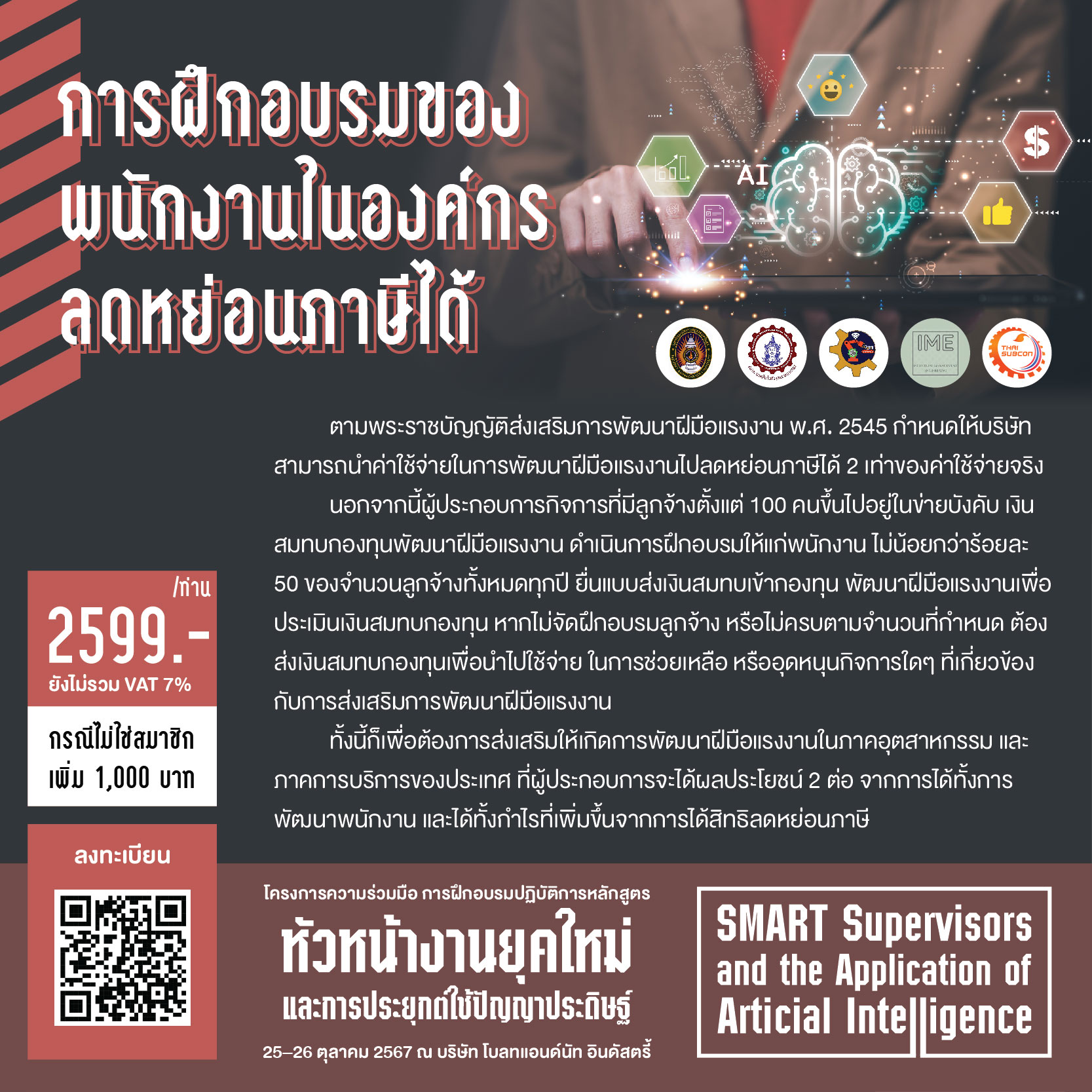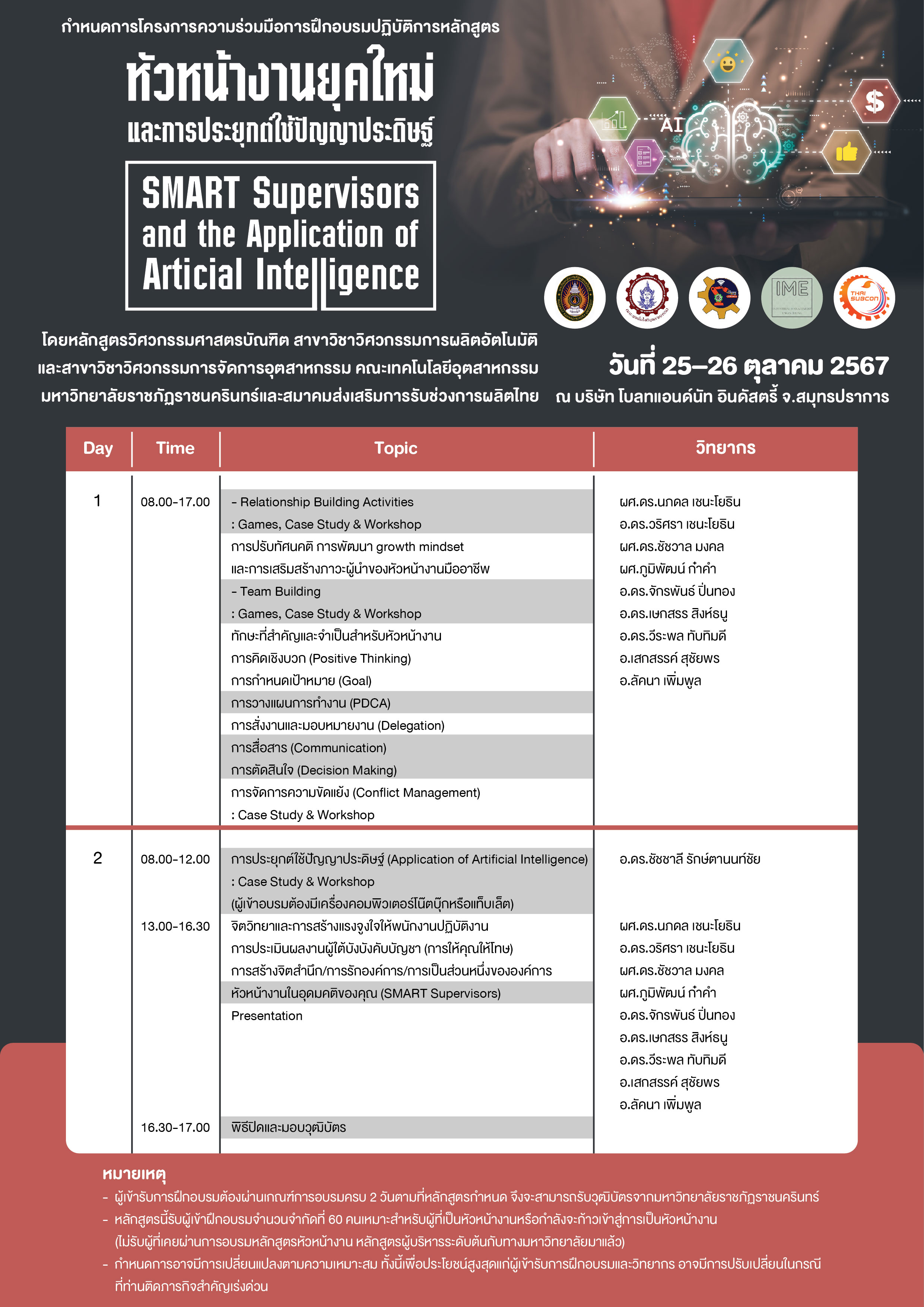 ขอเชิญร่วมฝึกอบรมหลักสูตร “หัวหน้างานยุคใหม่และการประยุกต์ใช้ปัญญาประดิษฐ์ (SMART Supervisors and the Application of Artificial Intelligence)”