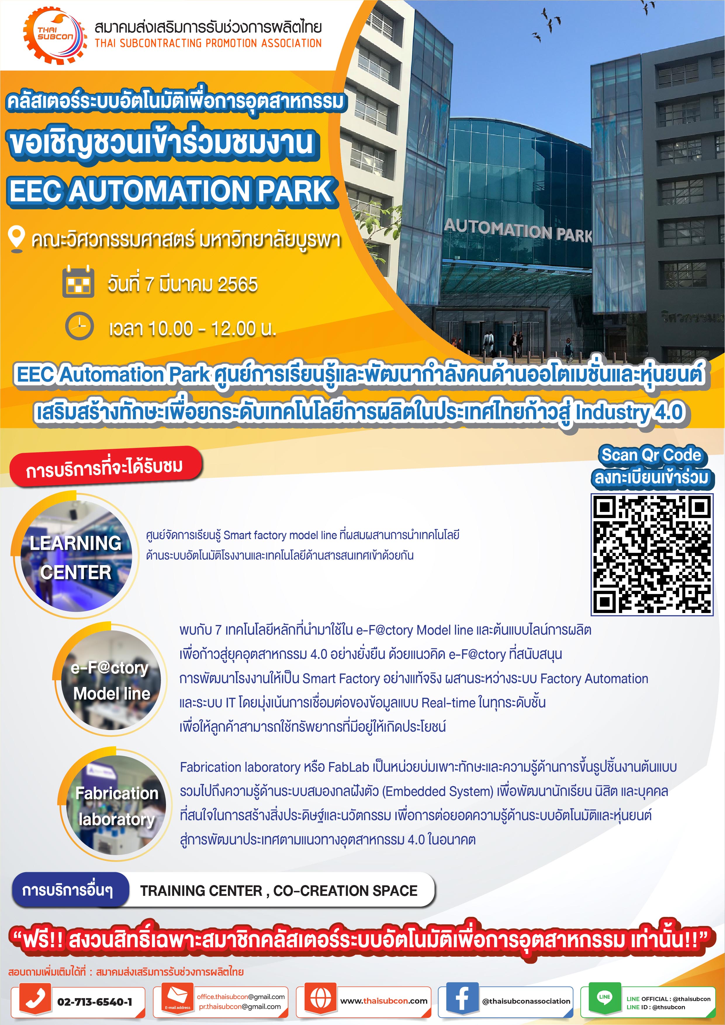 เมื่อวันที่ 7 มีนาคม 2565 ทางคลัสเตอร์ระบบอัตโนมัติเพื่อการอุตสาหกรรม สมาคมส่งเสริมการรับช่วงการผลิตไทย นำโดย นาย สมภพ เกลียวสัมพันธ์ ประธานคลัสเตอร์ฯ นาย มนัส ศรีวานิชภูมิ รองประธานคลัสเตอร์ นาย จิรัตน์ ต่อรัตนวัฒนา รองประธานคลัสเตอร์พาสมาชิกคลัสเตอร์เข้าร่วมเยี่ยมชมงาน EEC AUTOMATION PARK ณ คณะวิศวกรรมศาสตร์ มหาวิทยาลัยบูรพา ซึ่งเป็นศูนย์การเรียนรู้และพัฒนากำลังคนด้านออโตเมชั่นและหุ่นยนต์เสริมสร้างทักษะเพื่อยกระดับเทคโนโลยีการผลิตในประเทศไทยก้าวสู่ Industry 4.0