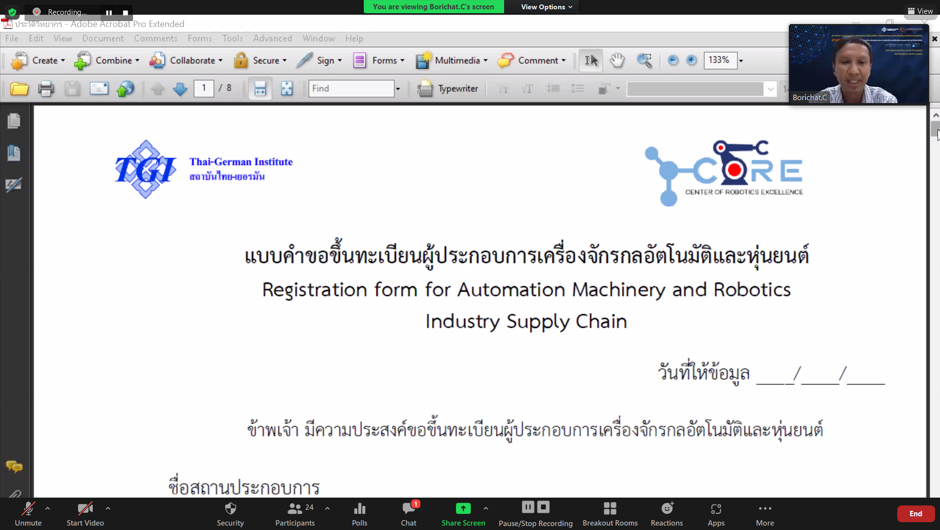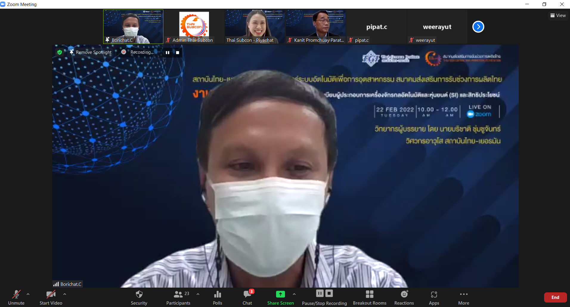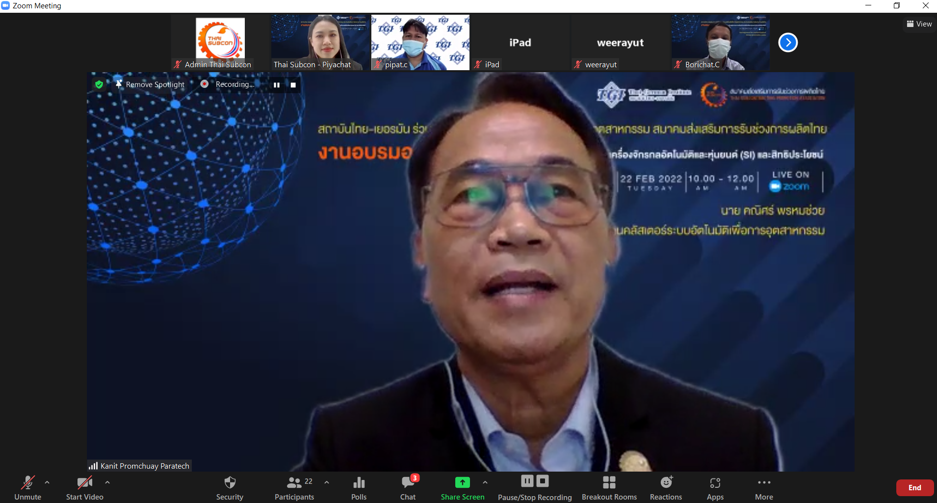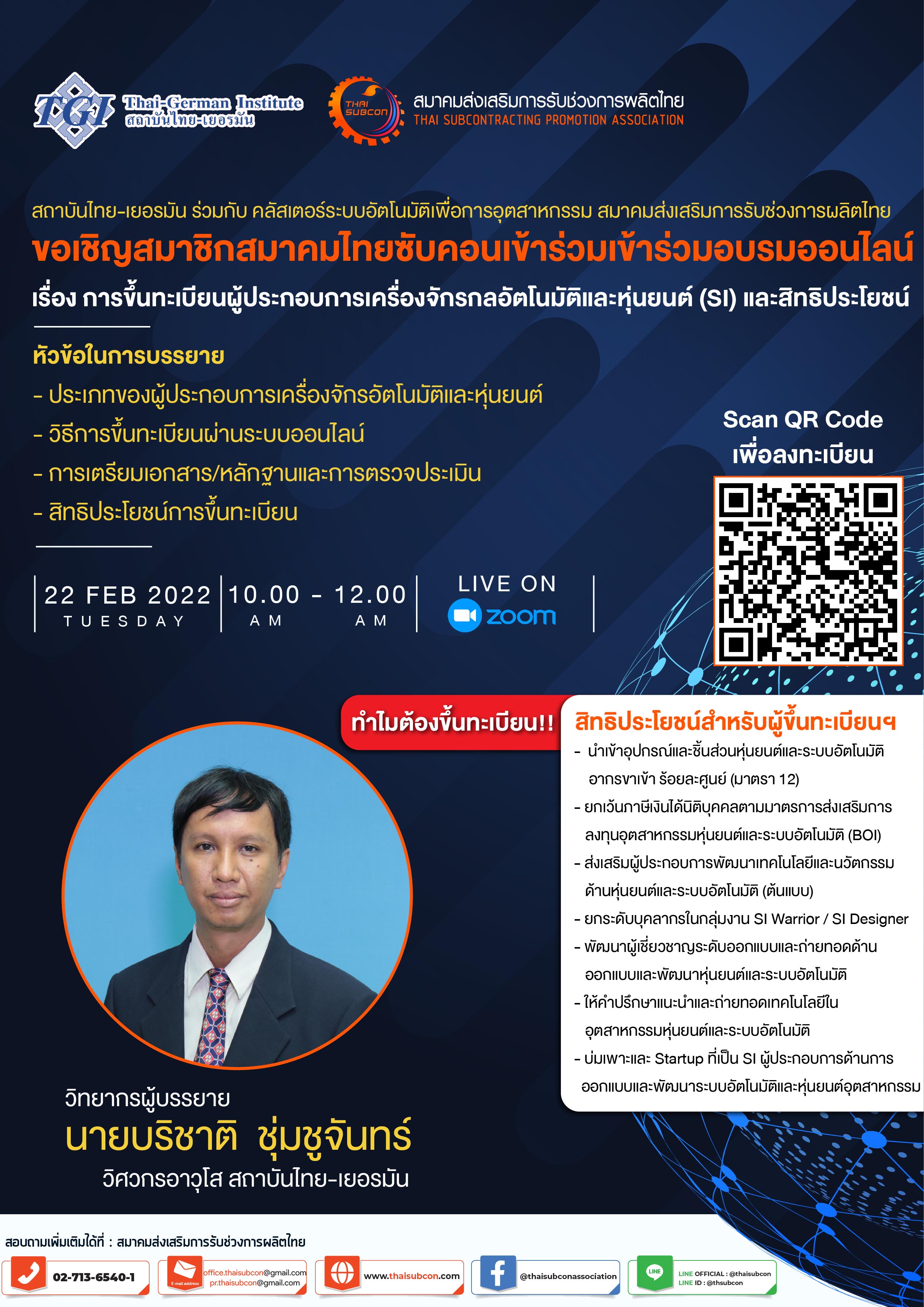 เมื่อวันที่ 22 กุมภาพันธ์ 2565 ทางสถาบันไทย-เยอรมัน ร่วมกับ คลัสเตอร์ระบบอัตโนมัติเพื่อการอุตสาหกรรม สมาคมส่งเสริมการรับช่วงการผลิตไทย ร่วมกันจัดงานอบรมออนไลน์ เรื่อง การขึ้นทะเบียนผู้ประกอบการเครื่องจักรกลอัตโนมัติและหุ่นยนต์ (SI) และสิทธิประโยชน์ โดยได้รับเกียรติจาก นาย คณิศร์ พรหมช่วย รองประธานคลัสเตอร์ระบบอัตโนมัติเพื่อการอุตสาหกรรม เป็นประธานฯ กล่าวเปิดงานดังกล่าว
